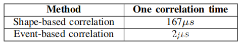 另一方面,基于事件的检测器比基于形状的检测器快两个数量级。上表比较了两个检测器的相关时间(超过100个实验的平均值)。造成这种差异的主要原因是,基于事件的相关器将事件元数据的离散时间序列用于其相关性,而基于形状的检测器随时间使用流量直方图。