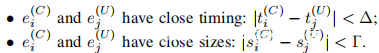 其中∆和d为阈值。请注意,即使SIM消息的大小在传输过程中没有改变,但较早引入的事件提取算法可能会进行大小修改,因为网络抖动能够划分/合并事件突发(即,由于以下原因,突发可以分为两个突发):由于用户带宽较小,网络抖动或两个突发可以合并在一起。