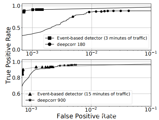 上图显示了基于事件的检测器与基于深度学习的检测器在3分钟和15分钟的流量下的ROC曲线。的基于事件的技术在误报率较小的情况下优于基于深度学习的分类器,例如,对于误报率为10^(-3)并使用15分钟的流量,基于事件的检测器可达到93%的准确度,而基于DeepCorr的技术则为88%对于较短的流量观察,基于事件的检测器的性能优势显着提高,例如,当使用3分钟的流量进行检测时,分类器可提供92%的准确性,而基于DeepCorr的分类器可提供45%的准确性(对于误报率为10^(-3))。