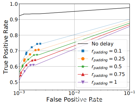 下图显示了具有不同rpadding和ppadding = 10^(-4)的基于事件的检测器的ROC曲线。请注意,ppadding = 10^(-4)导致平均流量开销为7%。不出所料,增加rpadding会降低攻击的性能;即使仅减少10%和7%的虚拟事件,也可以显着影响流量分析攻击,即,对于10^(-3)的误报率,检测精度从93%降低到62%。将rpadd增加到50%会将检测精度进一步降低到56%。