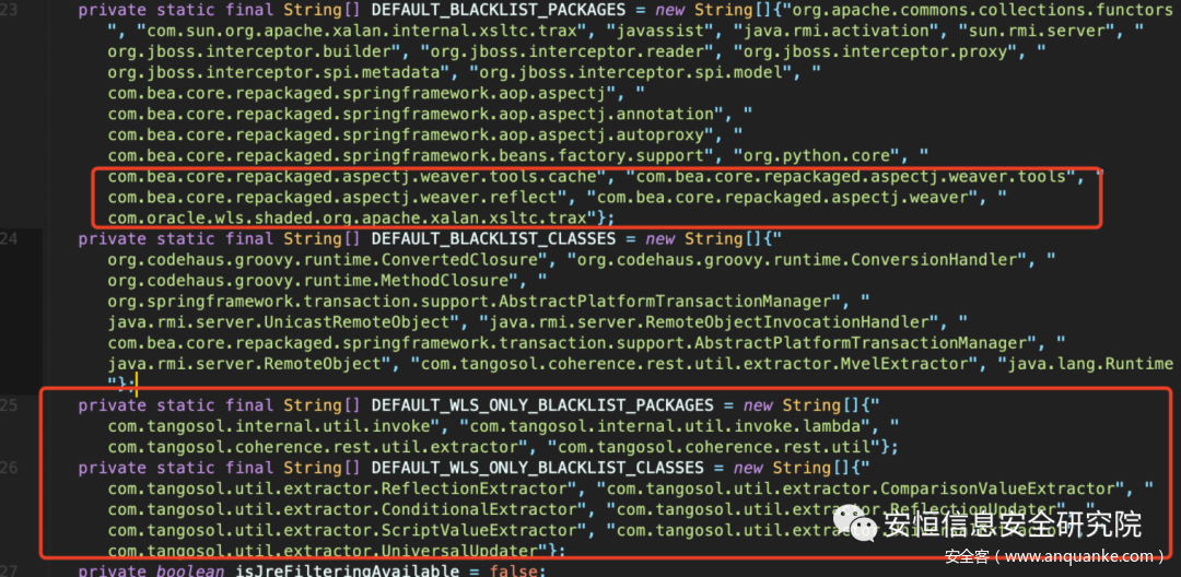看到最新补丁的黑名单中不仅过滤了 com.tangosol.util.extractor.UniversalExtractor ,还过滤了 com.tangosol.util.extractor 包下的其他几个类,另外也把com.tangosol.coherence.rest.util.extractor、com.tangosol.internal.util.invoke.lambda 等一些包加入了黑名单中。