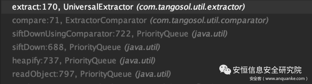 入口同 CVE-2020-2883,利用 java.util.PriorityQueue 反序列化时会间接调用 com.tangosol.util.ValueExtractor 接口任意实现类的 extract 方法。