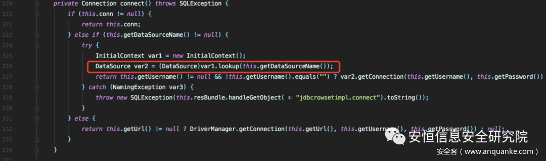 跟进 this.connect() ,可以发现只要 this.getDataSourceName() 可控,我们就能进行JNDI注入。