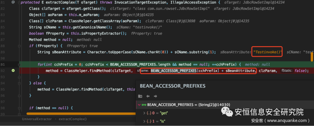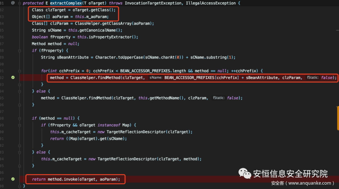 跟进else条件中的 extractComplex 方法,该方法中也有一个 invoke 操作,虽然我们可以控制参数 oTarget 和 aoParam ,但是 method 对象的获取过程也有一个if条件。