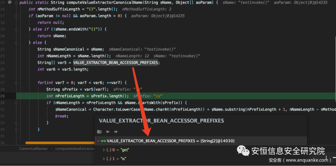 接着看下 CanonicalNames.computeValueExtractorCanonicalName ,如果 aoParam 不为 null 且数组长度大于0就会返回 null ,因此我们可调用的方法必须是无参的。接着如果方法名 sName 不以 () 结尾,则直接返回方法名。否则会判断方法名是否以 VALUE_EXTRACTOR_BEAN_ACCESSOR_PREFIXES 数组中的前缀开头,是的话就会截取掉并返回。