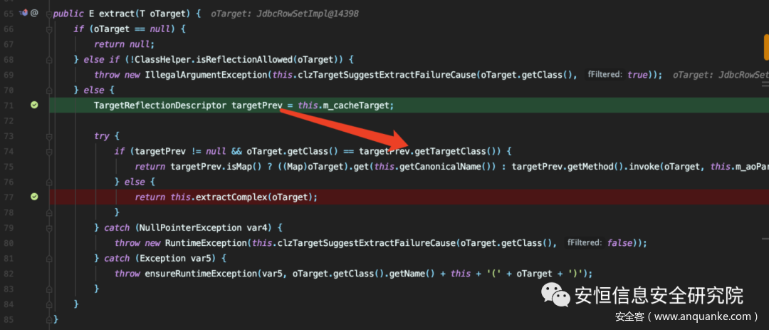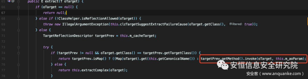 extractComplex 方法中对 this.m_cacheTarget 进行了赋值,因此我们第二次调用 UniversalExtractor#extract 方法时可以进入到if条件中执行 targetPrev.getMethod().invoke() 。