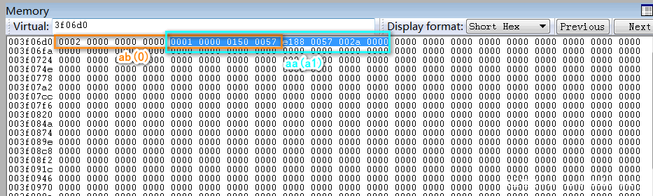 通过循环不断重新定义数组,扩大数组规模,直至数组aa与ab于内存中相邻(准确 来说,二者相差8字节):
