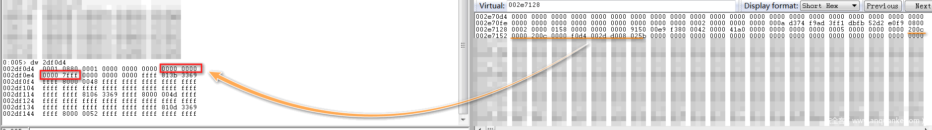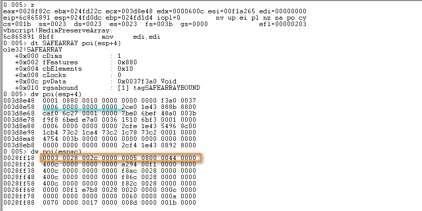 myarray起始地址为0,rgsabound.cElements为0x7fff0000,故可读写vbscript!COleScript+0x170处内容: