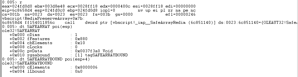 打开该POC,使用WinDbg附加调试,于vbscript!RedimPreserveArray函数处设断,允许阻止的内容: