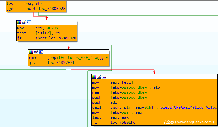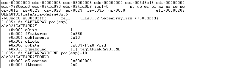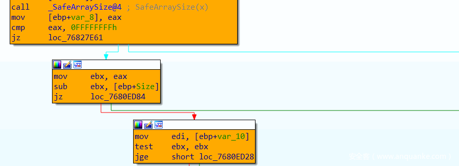 POC中&h8000000(该值经过SafeArraySize函数计算后为0x80000000)正是利用以上三点,实现任意地址读写——test ebx, ebx与jge组合进行有符号数比较,neg对其取反仍为0x80000000。