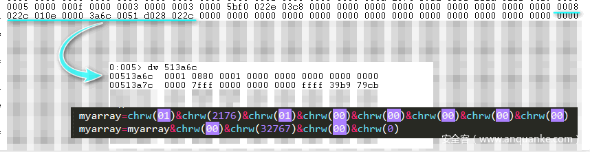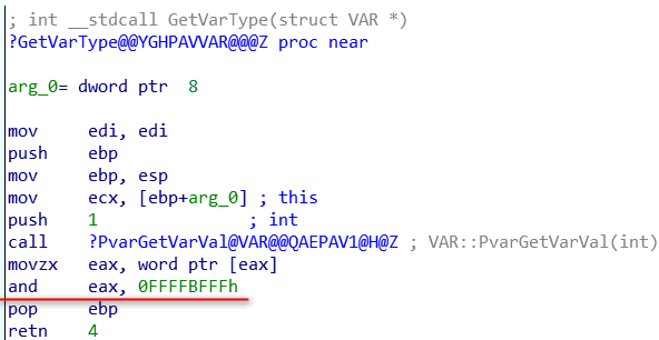 如此一来,可通过aa数组访问ab数组元素(由ab起始位置偏移8字节)。type1=&h2f66判断是由于GetVarType函数返回前会将vt与0xFFFFBFFF作与运算: