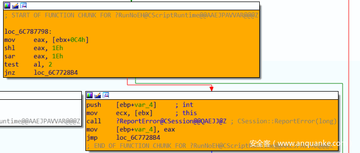 而不会执行后续i = null语句,感兴趣的读者可自行探索CScriptRuntime::RunNoEH函数,不在这里过多展开(该函数功能复杂,笔者仅是简单跟踪是否加入On Error Resume Next语句的执行流):