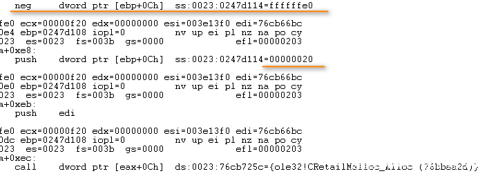 neg [ebp+psaboundNew]对调整数组元素大小与原数组元素大小差值取相反数,将其传递给HeapAlloc函数分配相应大小堆块