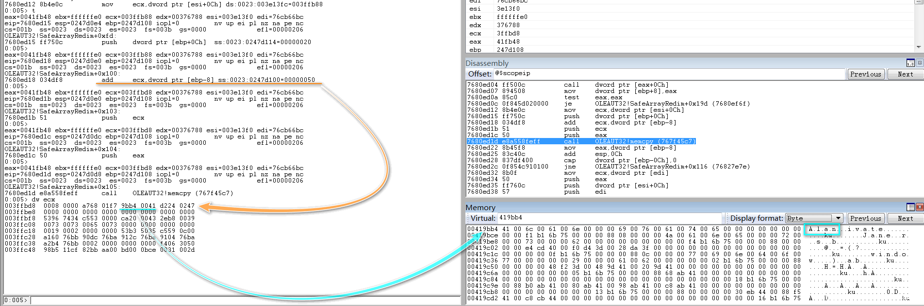 该函数功能用于读取参数add指向内存,关键函数是cbLengthBstr(具体请参考Internet Explorer漏洞分析(三)[上]——VBScript Scripting Engine初探中的0x05 LenB函数一节)。ab(0)=1.69759663316747E-313: