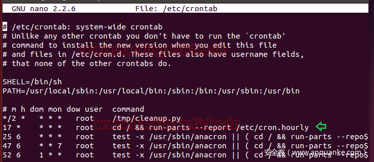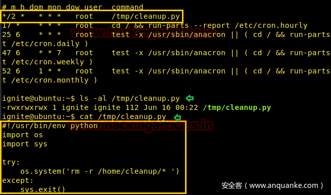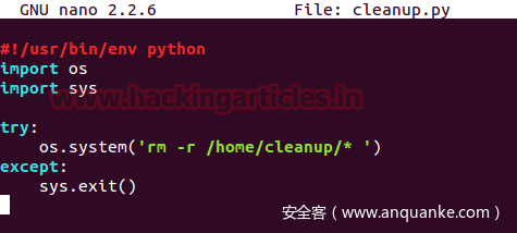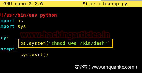 有很多方法可以获得root访问权限,就像在这个方法中我们启用了SUID位/bin/dash。这很简单,首先,通过一些编辑器打开文件。例如,nanocleanup.py。并从下面的行中替换“rm -r /tmp/*”,如下所示。