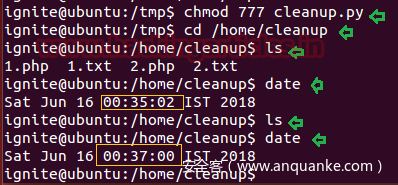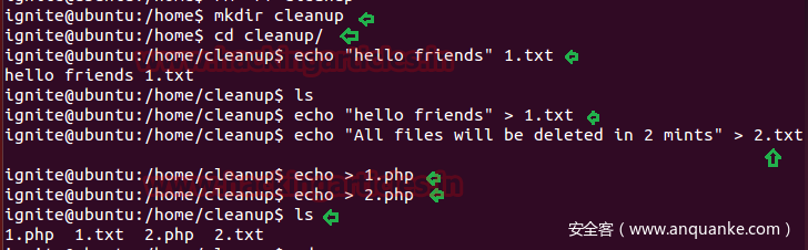 假设“cleanup”就是每2分钟自动删除一次数据的目录。因此,我在/home/cleanup中保存了一些数据。