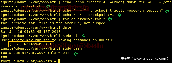 echo ‘echo “ignite ALL=(root) NOPASSWD: ALL” > /etc/sudoers’ >test.sh