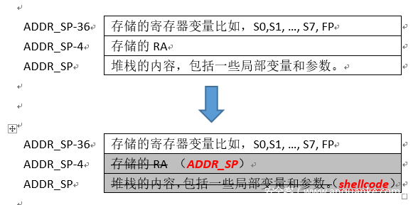 首先,我们先从一个比较直观的角度来了解一下,一个shellcode它在缓冲区溢出攻击的过程所扮演的角色和所处的位置。