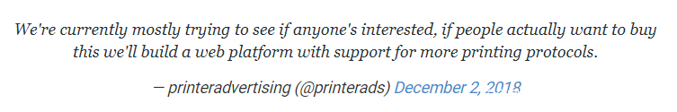 据了解,在Twitter上有一位名为@printerads的用户表示这个恶意广告服务就是TA在运营着。他表示,这个恶意广告活动的主要目的是为了看看这个世界上到底有没有人真的对这种服务感兴趣。如果真的有人感兴趣,而且用户量很大的话,他们很可能会继续升级这个服务,并支持更多的打印协议。