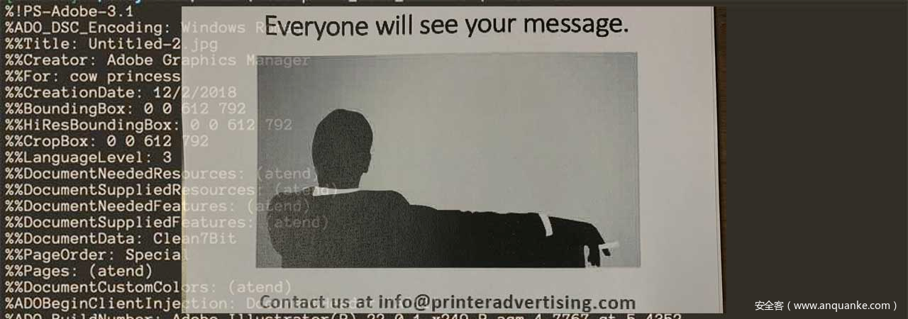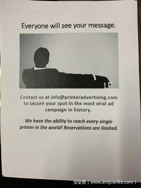 近期,一个名为Printeradvertising.com的服务声称他们可以黑掉全世界上任何一个地方的联网打印机,并让这些打印机打印恶意广告信息。