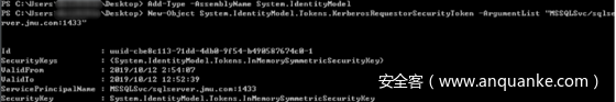 > New-Object System.IdentityModel.Tokens.KerberosRequestorSecurityToken -ArgumentList "MSSQLSvc/sqlserver.jmu.com:1433"