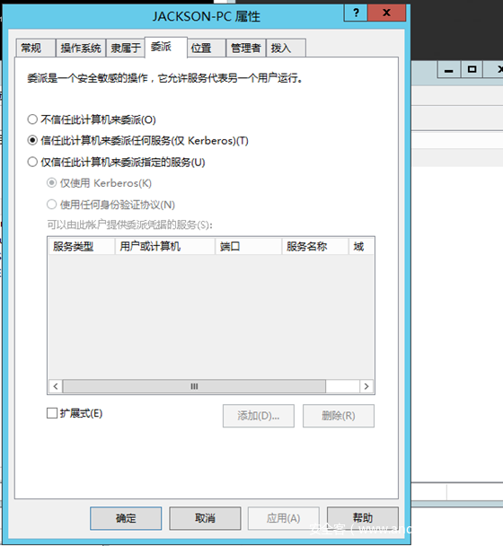 服务(如JACKSON-PC$) 被配置了非约束的委派,那么JACKSON-PC$可以接受任何用户的委派的去请求其他所有服务。在协议层面的实现就是,某个用户委托JACKSON-PC$去访问某个服务,那么这个用户会将 TGT(在TGS里面)发送到JACKSON-PC$并缓存到LSASS中,以方便以后使用。 然后JACKSON-PC$模拟用户去请求某个服务。