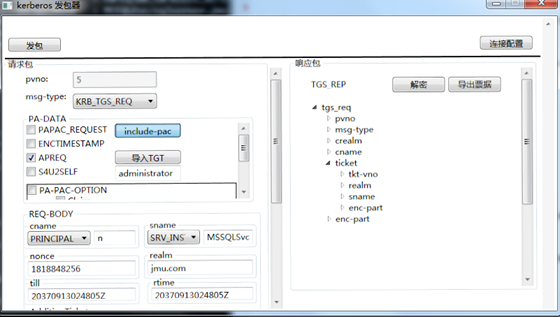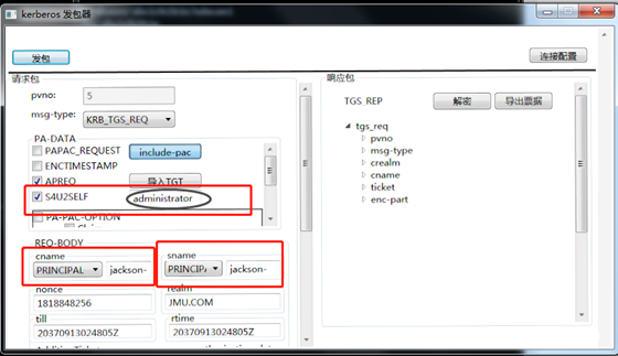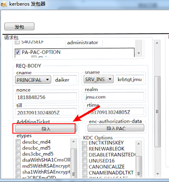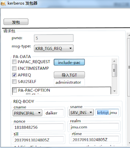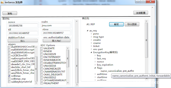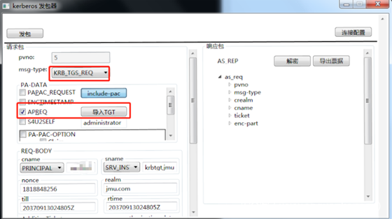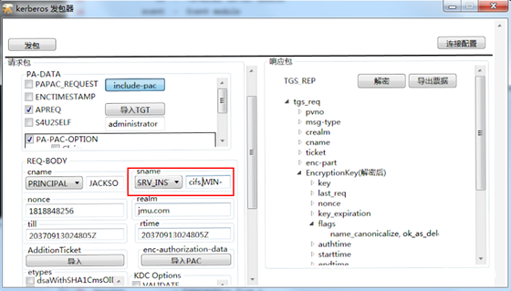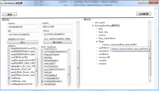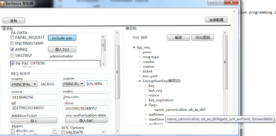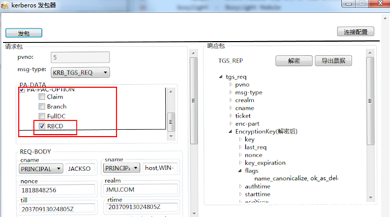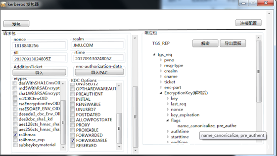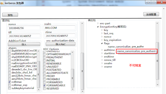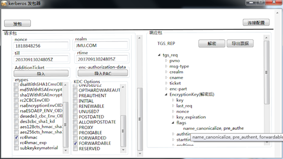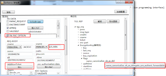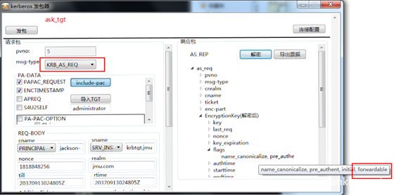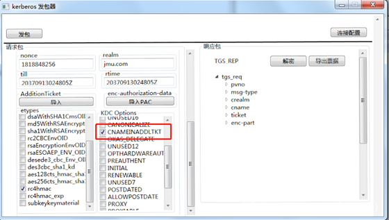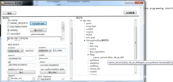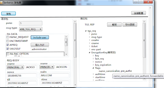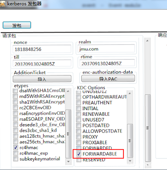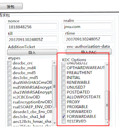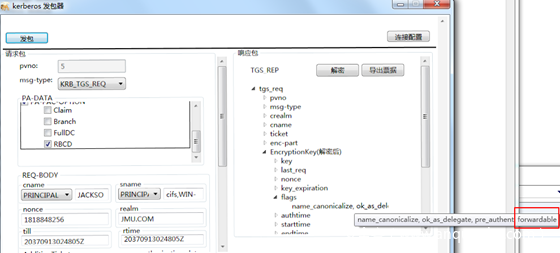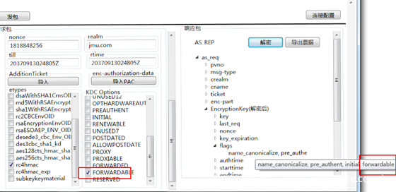 服务1 使用自己的hash向KDC申请一个TGT票据,注意在KDC Option里面选择FORWARDABLE标志位,这样的话请求的TGT票据就是可转发的TGT票据。
