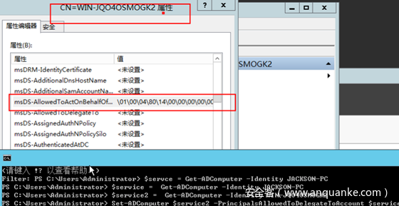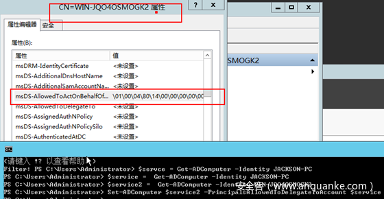 在服务账户2的用户属性上配置msDS-AllowedToActOnBehalfOfOtherIdentity为服务账户1的sid