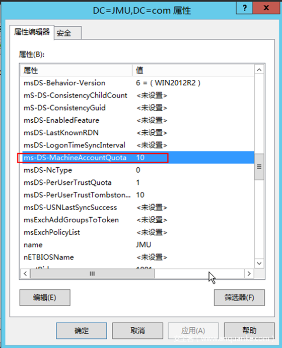 默认的Active Directory ms-DS-MachineAccountQuota属性设置允许所有域用户向一个域中最多添加10个计算机帐户。