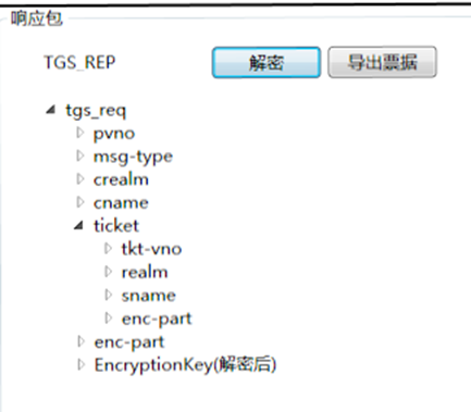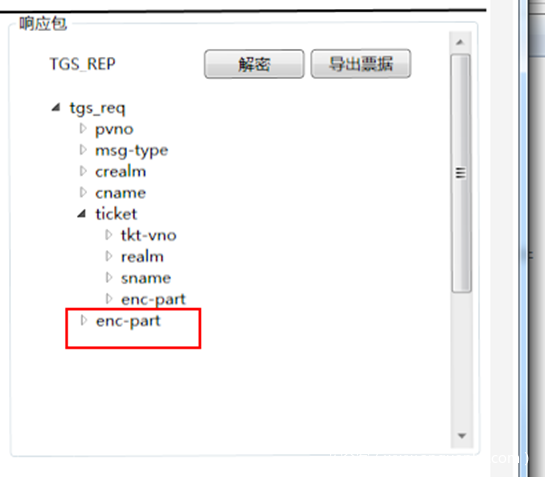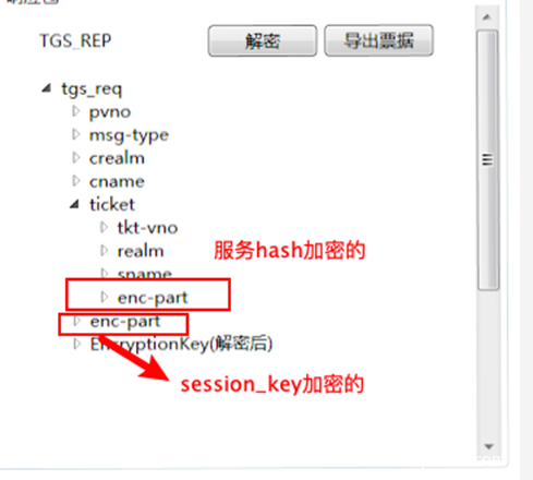 这个ticket用于APREQ的认证。其中里面的encpart是加密的,用户不可读取里面的内容。在ASREQ请求里面是,是使用krbtgt的hash进行加密的,而在TGSREQ里面是使用要请求的服务的hash加密的。因此如果我们拥有服务的hash就可以自己制作一个ticket,既白银票据。详情见相关的安全问题>白银票据.正因为是使用要请求的服务的hash加密的,所以我们可以通过爆破enc_part获得该服务的hash,详情见相关的安全问题>kerberoasting。