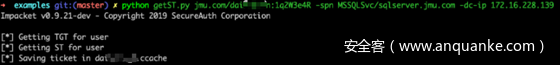在ccache中输入密码,哈希,aesKey或TGT后,此脚本将请求服务票证并将其另存为ccache。