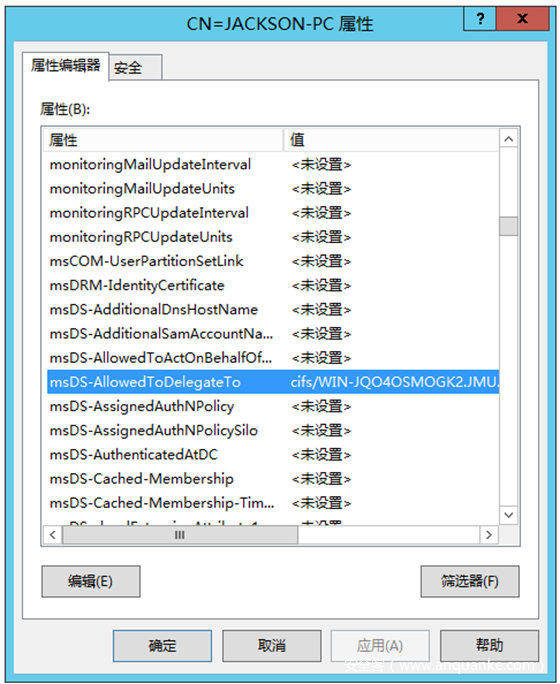 约束的资源委派,除了配置TRUSTEDTOAUTHFORDELEGATION 之外,还有个地方是存储对哪个spn 进行委派的,位于msDS-AllowedToDelegateTo