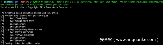 该脚本将从零开始或基于模板(从KDC合法请求)创建Golden / Silver票据,允许您自定义PACLOGONINFO结构中设置的一些参数,特别是组,ExtraSids,持续时间等,票据格式是ccache.