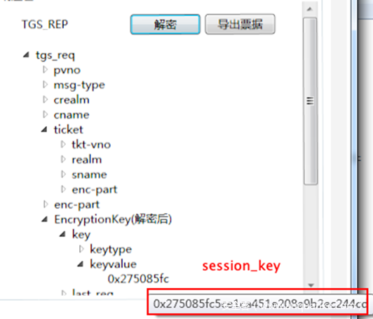 这部分是可以解密的,key是上一轮ASREP里面返回的sessionkey,也就是导入凭据里面的 sessionkey,解密后得到encryptionkey,encryptionkey这个结构里面最重要的字段也是sessionkey(但是这个sessionkey 不同于上一轮里面的sessionkey),用来作为作为下阶段的认证密钥。