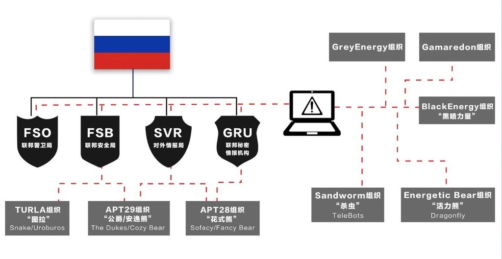 支撑俄罗斯在网络空间肆意征战的根源,在于其复杂且庞大的网军图谱。在FSO(联邦警卫局)、FSB(联邦安全局)、SVR(对外情报局)、GRU(格勒乌)四驾马车护航下,APT 28、APT 29、Turla等众多APT组织强军出击。