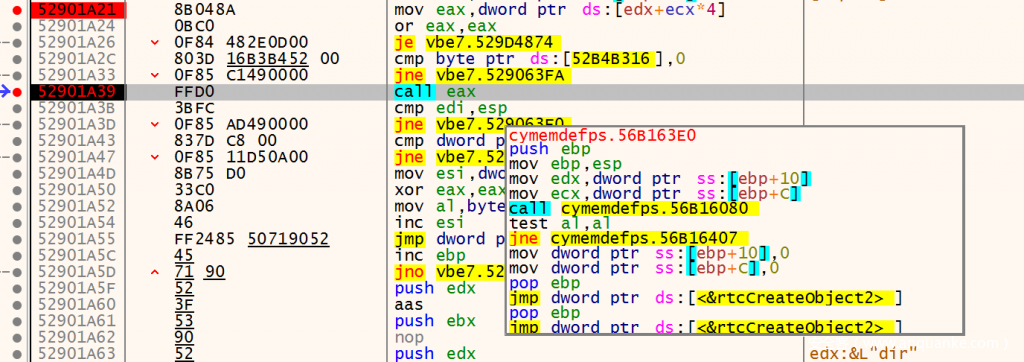 前面讨论过,Cylance中实现了基于Office的VBA宏防护机制(除了缺少Excel 4.0支持之外)。如果我们仔细检查这种防护,可以看到Cylance采用了前文类似的一些hook,在VBA运行时中添加了一些检查操作。在这种情况下,Cylance会将hook添加到VBE7.dll中,后者负责提供Shell或CreateObject之类的函数。