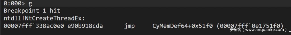 检查Cylance注入的DLL,可以发现Cylance在进程中植入了多个hook,以检测进程是否调用这些可疑函数。比如,如果我们在NtCreateThreadEx(为CreateRemoteThread提供syscall)上设置一个断点,然后调用该API,我们可以看到Cylance会通过JMP指令修改该函数: