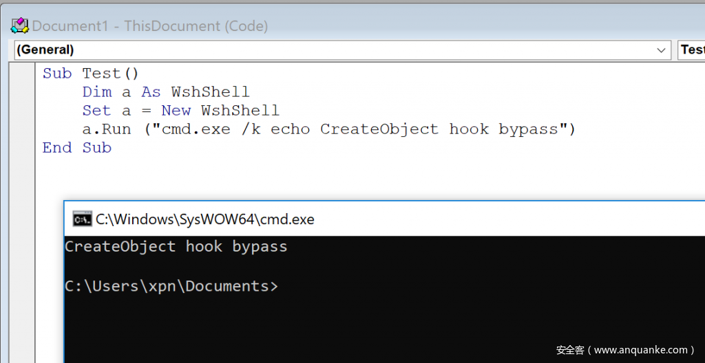 这样就可以在我们的VBA中访问WshShell对象,绕过被hook的CreateObject调用。一旦完成该操作后,我们就可以使用常见的Office宏技巧:
