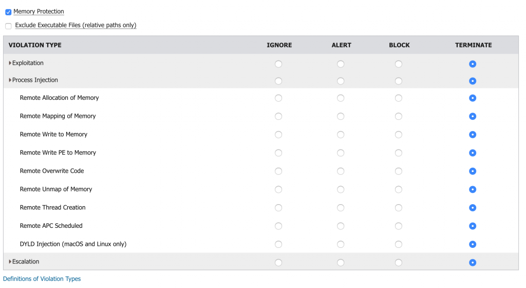 - 内存操作:控制启用哪些内存保护机制,包括漏洞利用、进程注入以及越界技术。