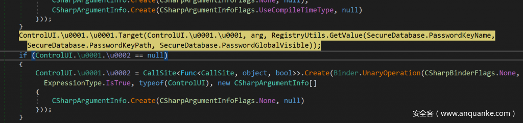 检查CylanceOptics assembly后,我们发现其中存在一个经过混淆的调用,该调用可以用来获取注册表键值: