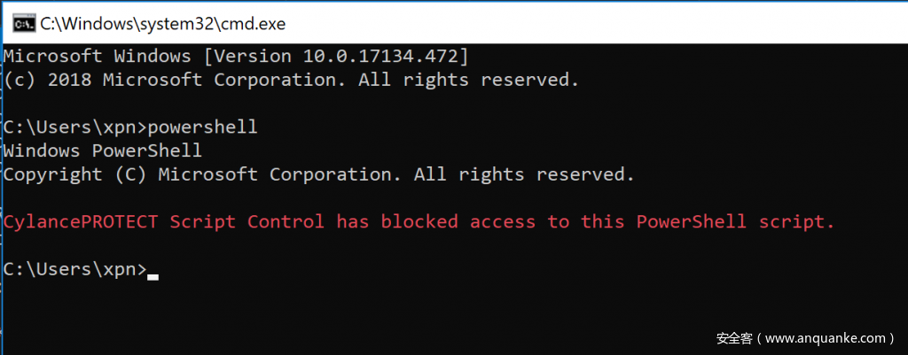 Cylance还提供另一项保护功能,可以阻止用户执行某些应用程序(如PowerShell)。启用该保护功能后,如果我们尝试执行PowerShell时,就会出现如下警告:
