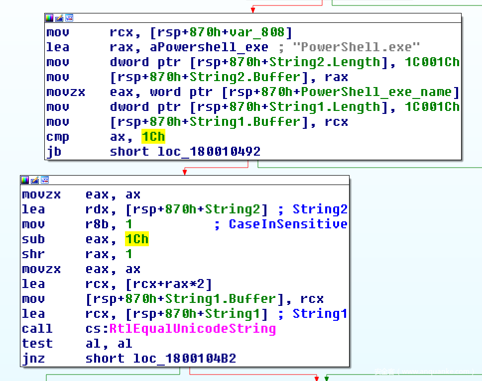 如果我们将PowerShell.exe可执行文件名改为PS.exe,是否能绕过这种限制?好吧可能没那么简单(但相信我们,在没引入其他缓解措施之前,这种方法可以绕过Cylance的PowerShell保护机制,万能的Powercatz.exe)。这表明Cylance还有其他校验措施,我们在同一个函数中找到了如下信息: