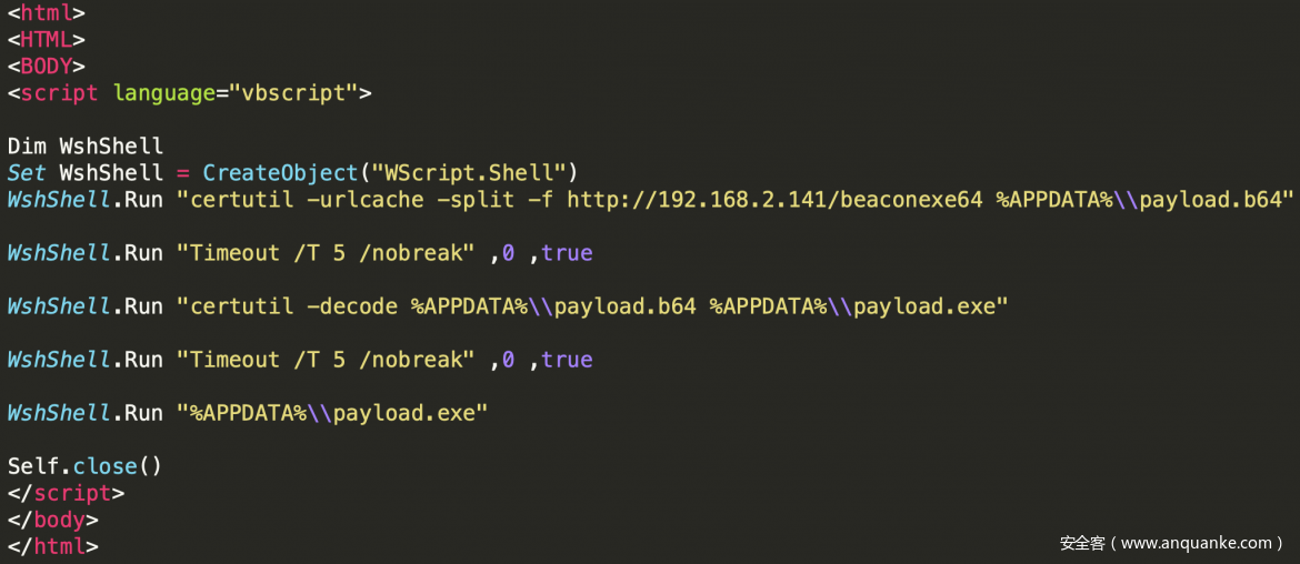 这里先不要管shellcode执行的问题(回头我们会解决这个问题),我们发现Cylance对执行calc.exe的方式并不是特别感冒(不管是通过宏或者HTA payload)。再来看看如果尝试下载或运行Cobalt Strike beacon会出现什么情况。这里我们使用如下HTA,通过WScript调用certutil来下载和执行Cobalt Strike可执行文件: