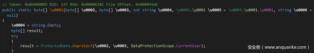 我们发现该调用会提取注册表中HKEY_LOCAL_MACHINE\SOFTWARE\Cylance\Optics\PdbP的值,随后该值会传递给.NET DPAPI ProtectData.Unprotect API: