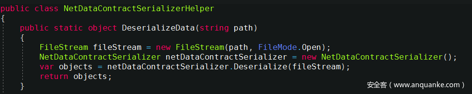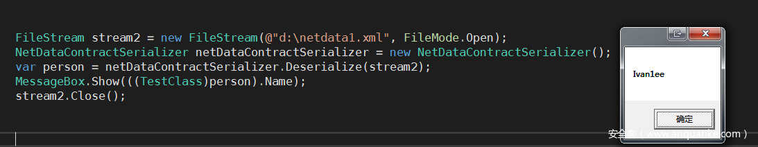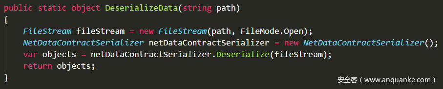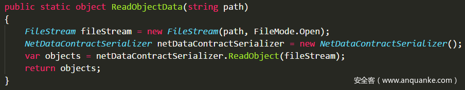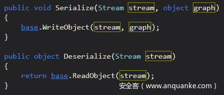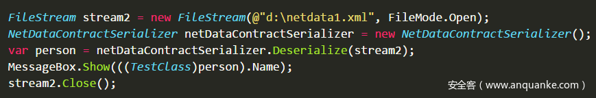 NetDataContractSerializer类实现了XmlObjectSerializer抽象类中的WriteObject、ReadObject方法,也实现了IFormatter中定义的方法。笔者通过创建新对象的方式调用Deserialize方法实现的具体实现代码可参考以下