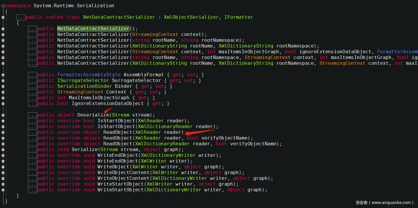 NetDataContractSerializer类反序列过程是将XML流转换为对象,通过创建一个新对象的方式调用ReadObject多个重载方法或Serialize方法实现的,查看定义得知继承自XmlObjectSerializer抽象类、IFormatter接口,