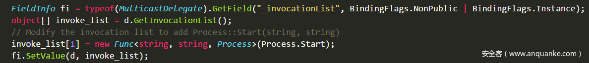 多路广播委托的调用列表GetInvocationList方法在内部构造并初始化一个数组,让它的每个元素都引用链中的一个委托,然后返回对该数组的引用,下面代码修改了私有字段_InvocationList并用泛型委托Func返回Process类。